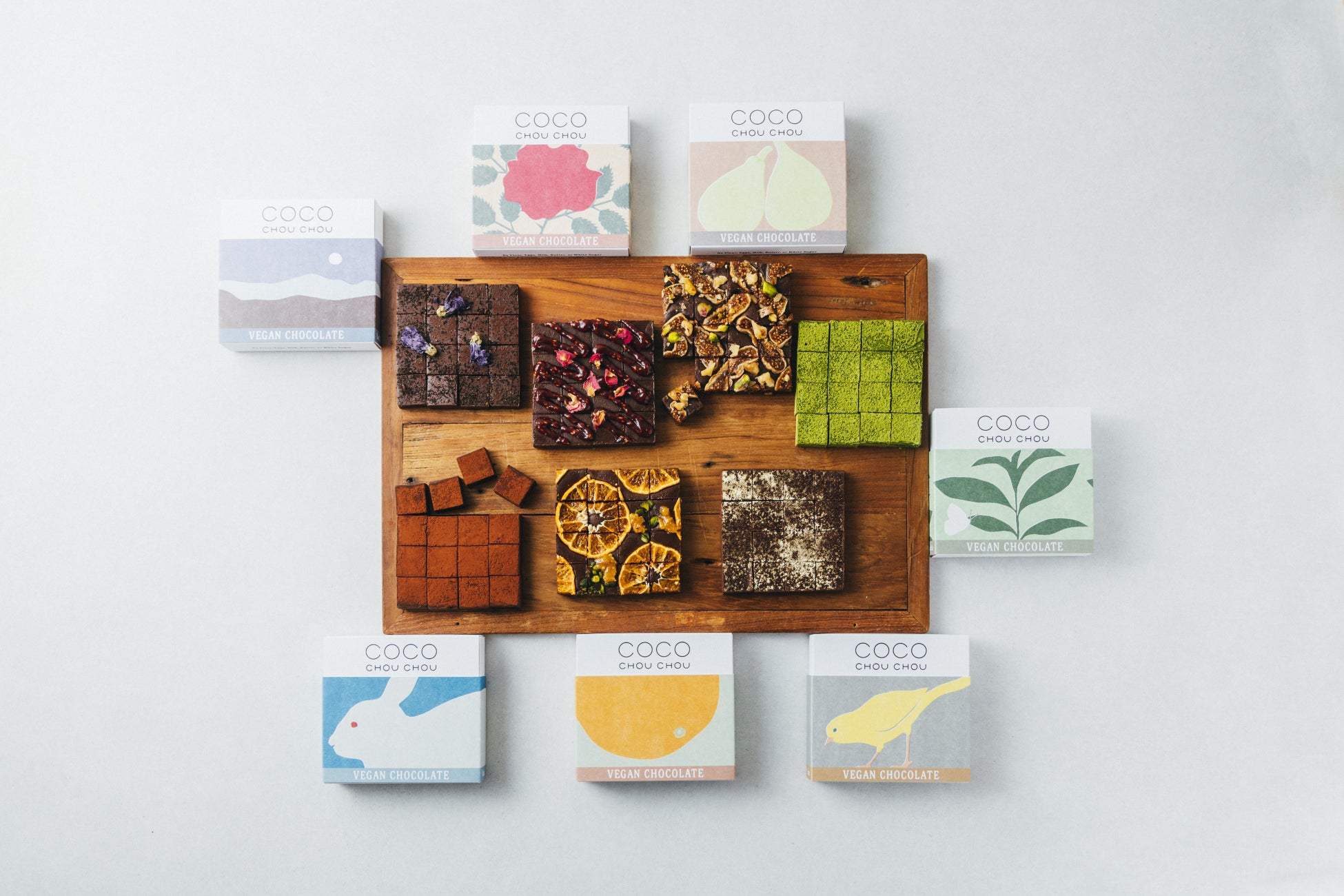 ヴィーガン生チョコレート 全7フレーバー(プレーン、抹茶、ラズベリー&ローズ、アールグレー、ジンジャー、いちじく&ナッツ、マンダリンオレンジ)・サイズ:9×9cm箱 16粒