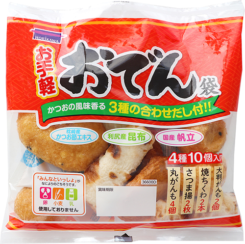 入っている「らくらくおでん袋」や、じゃがいもで作ったおもちのもちもち食感が楽しい「い