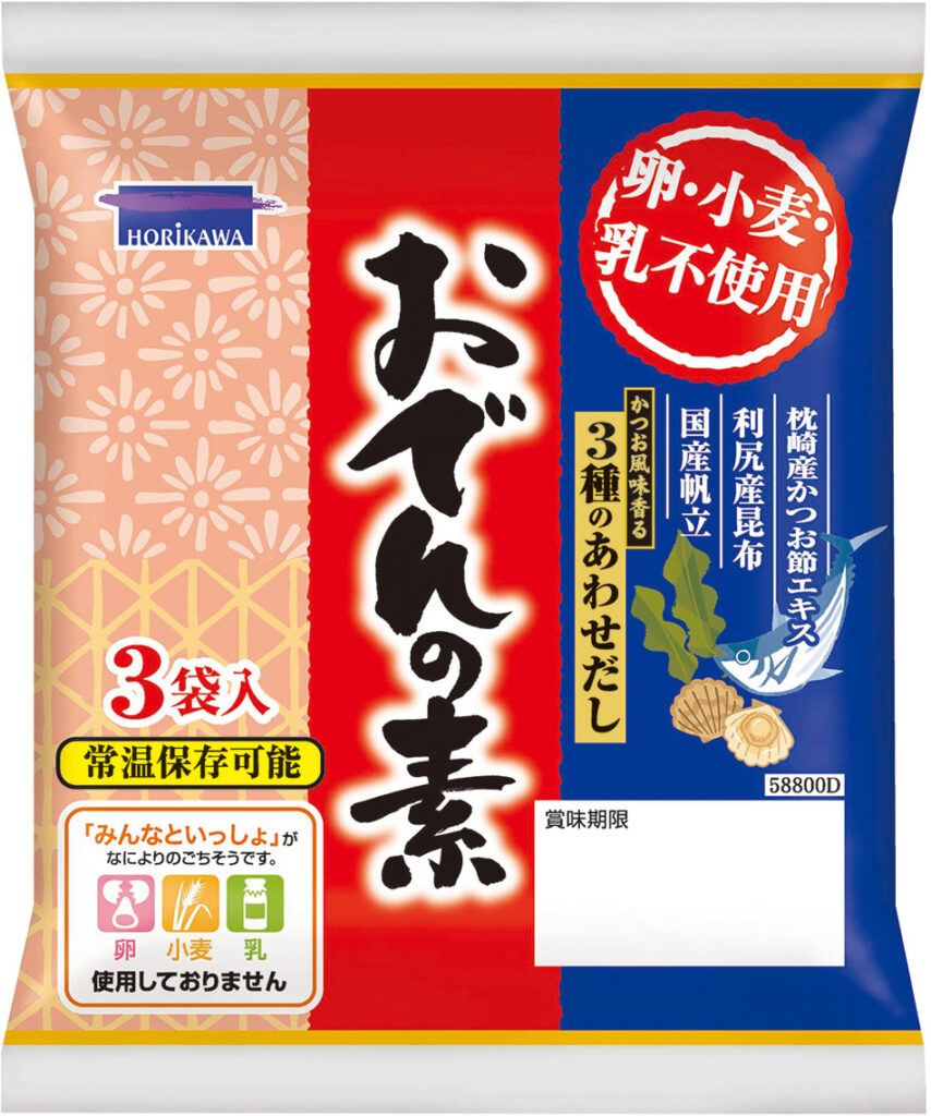 堀川オリジナルの卵・小麦・乳不使用のおでんの素。枕崎産かつお節エキス、利尻産昆布、国産帆立を使用しています。秋冬定番商品のおでん袋にも入っているおでんの素で、お客さまより「おでんの素だけで販売してほしい!」とのお声を多くいただいたことがきっかけとなり商品化となったアイテムです。